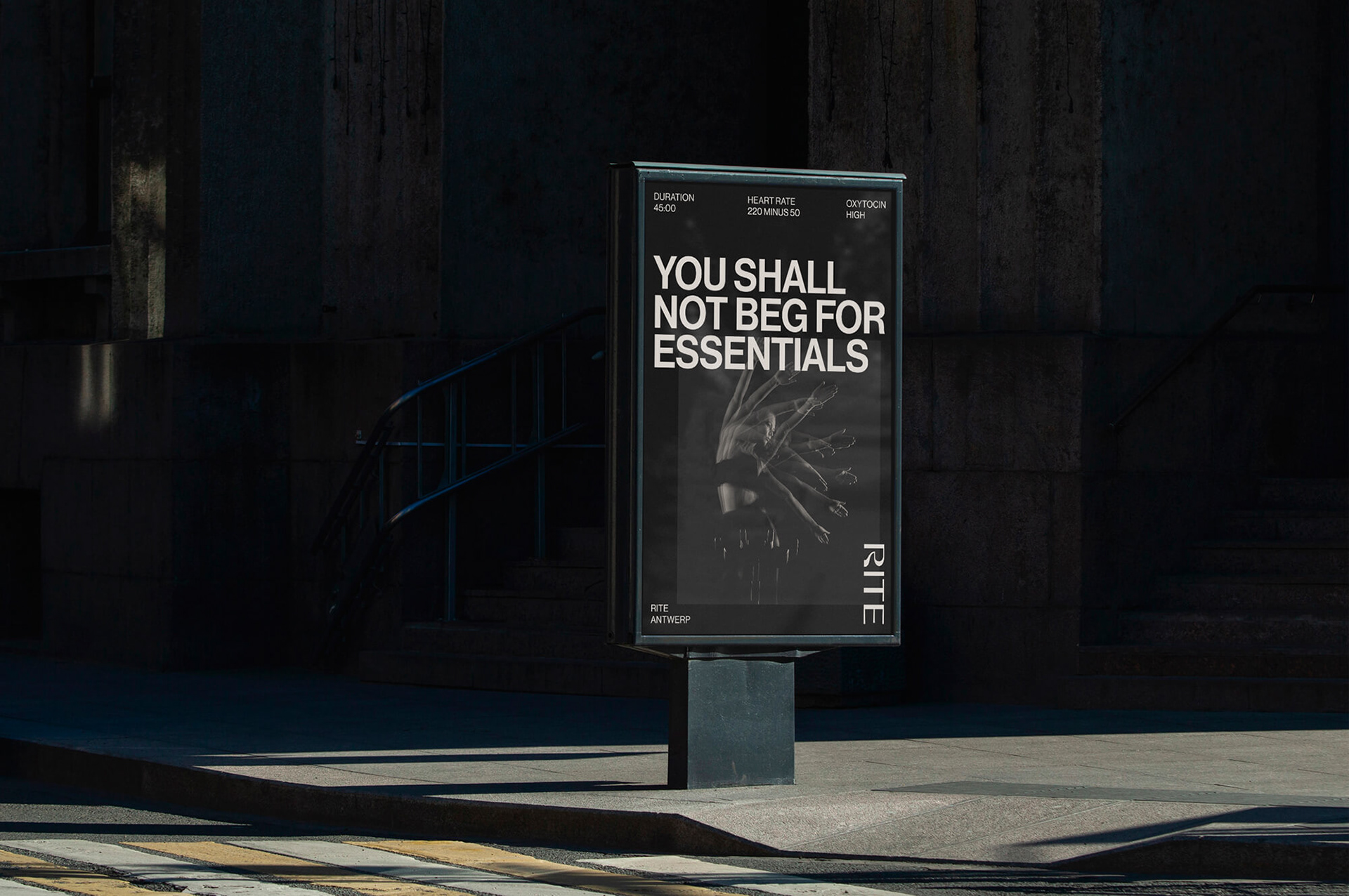 While we mainly know stroboscopic flash photography from the clubbing scene, it was actually a scientific invention to register movement. We used this technique to create visuals of people spinning. It serves as an abstract graphic language to capture the rhythm and motion of the Rite cycling classes.