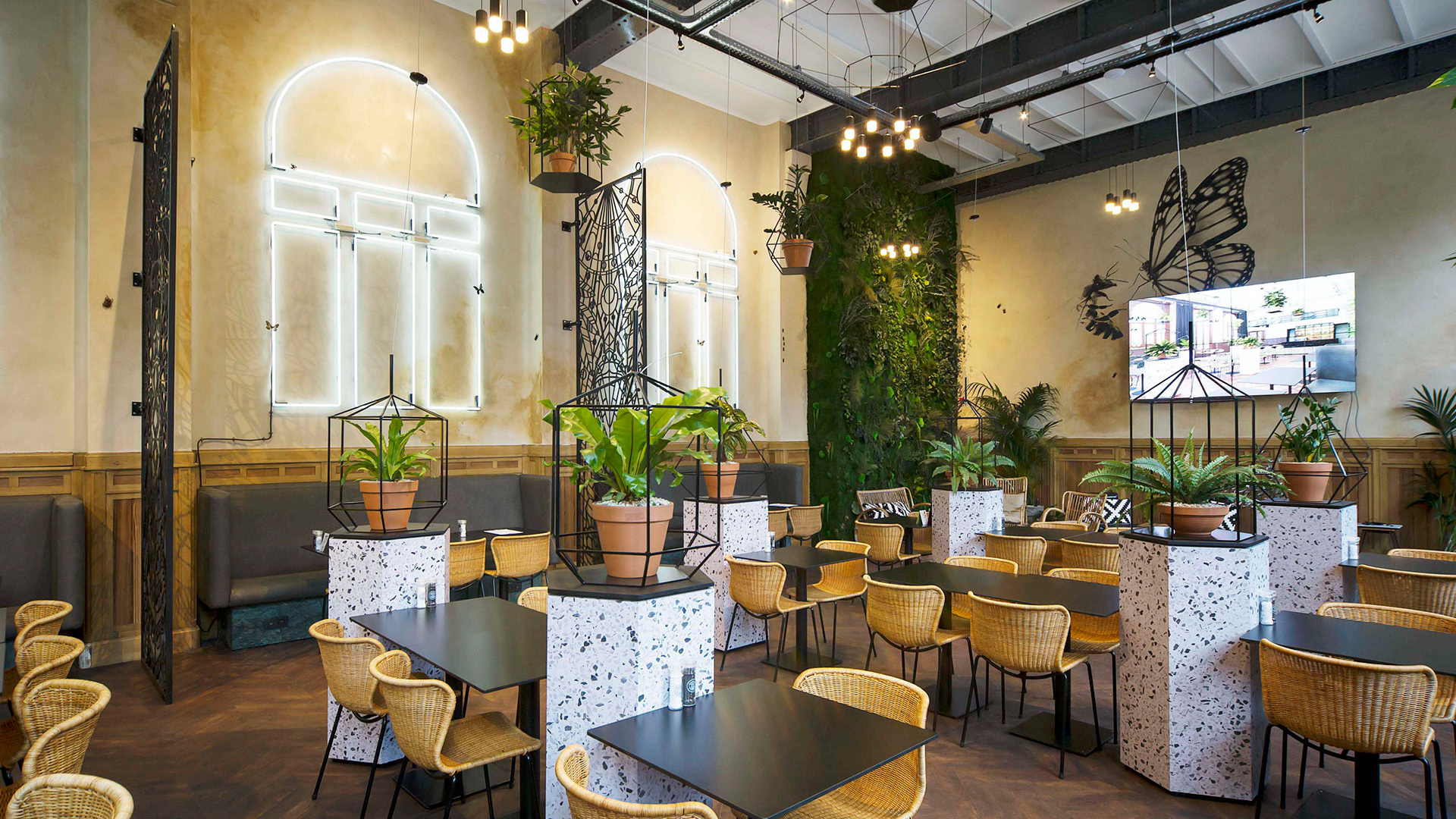 We turned this inspiring venue into an abstract greenhouse, creating metal frames with illustrations based on the insect world, and placing real bugs on the wall. This was combined with inspiring wall paintings and beautiful walls of greenery.